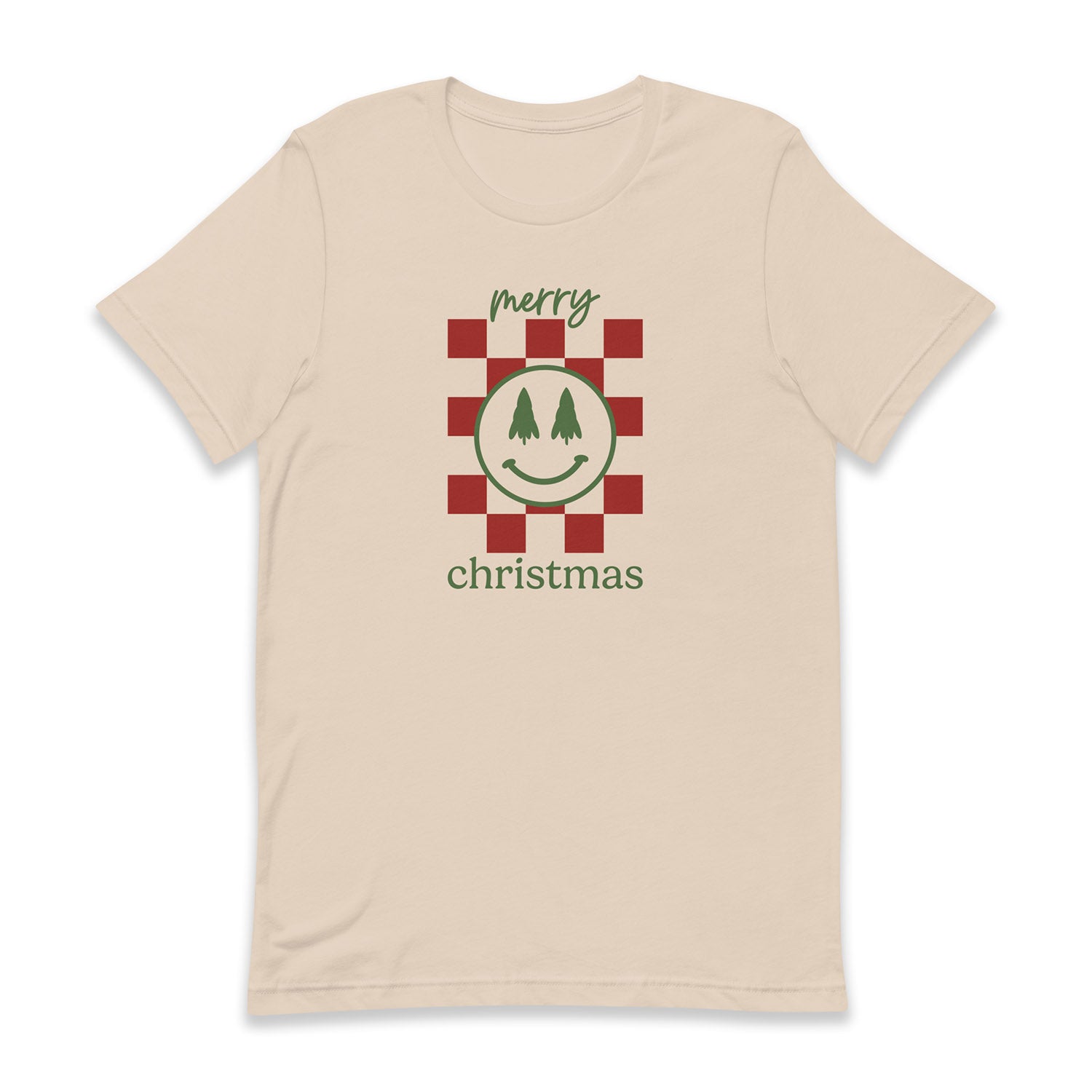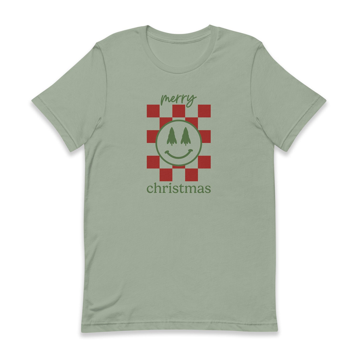 Get in the holiday spirit with this Merry Christmas checkerboard smiley tee! This Bella Canvas t-shirt is super soft and comfy. For a looser fit, I'd recommend sizing up.